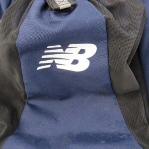 Used New Balance backpack in navy blue and black canvas. Approx. dimensions: 18" x 13" x 5". Features padded shoulder straps, front zip pocket, and main compartment with plenty of storage. Some wear from use look at photo's —no rips, just dust stains