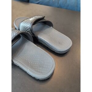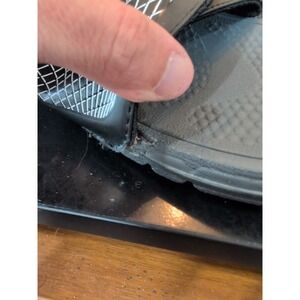 The product is a pair of New Balance men's slide sandals in black and white, size 9. They feature a cushioned design with a synthetic upper material, making them comfortable and durable. Perfect for casual wear, these sandals are stylish and easy to slide on and off. The black color and slide style make them versatile for various outfits and occasions. Some stitching separation. See photos