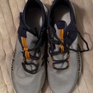 Modern New Balance shoes in navy and gray. Features yellow highlights. Ideal for everyday comfort.