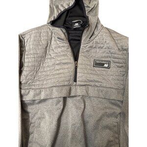 new balance jacket, men's pullover, hooded jacket, quilted pullover, lightweight hoodie, gray jacket, small size jacket, 1/4 zip pullover, casual outerwear, sporty jacket, fall jacket, new balance apparel, polyester blend hoodie