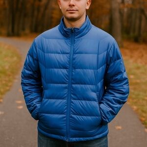 New Balance Men's M Down Feathers Puffer Jacket, Sleek Blue, EUC, Filling 90% Grey Down 10% Feathers. Experience warmth with this sleek blue puffer. Ideal for cold weather.