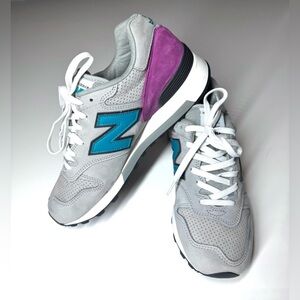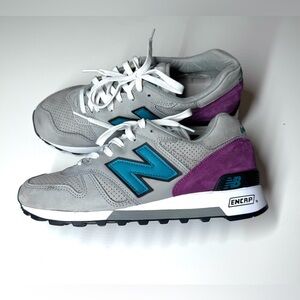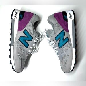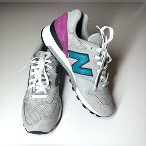 New Balance sneakers in gray with bold blue and purple highlights. Ideal for everyday style.