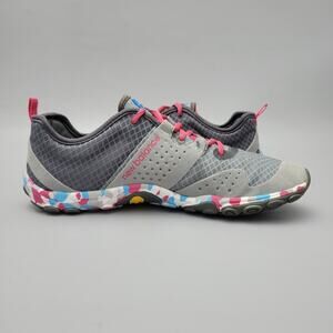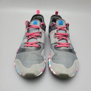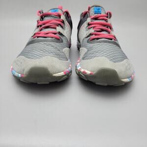 The New Balance Minimus shoes for women in size 9B feature a Vibram sole for optimal grip on trails. With a breathable mesh upper and lightweight design, these athletic sneakers are perfect for trail running. The geometric pattern in multicolor adds a stylish touch to the minimalist and athleisure theme of the shoe. Designed for performance and comfort, these New Balance shoes are a great option for active women looking for a quality footwear option.