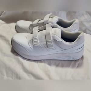white new balance hook and loop leather velcro close casual comfort walking shoes. size 11. in lightly used condition. see pics for details of condition. rollbar stability. absorbs impact.