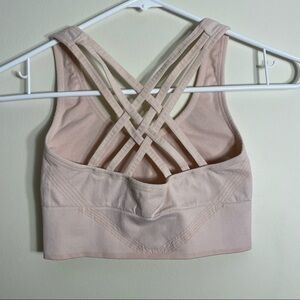 A pretty pink sports bra with detailed strap detail on the back. Labeled a women’s size small.