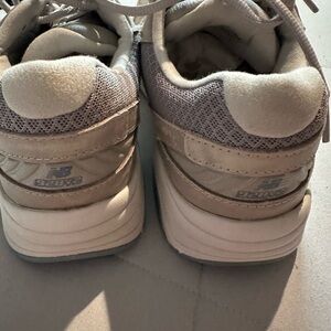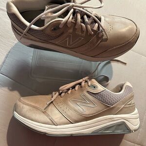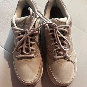 Comfortable taupe walking shoes with gray accents. Features lace-up design and cushioned sole.