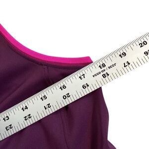 This sleeveless athletic dress features a dark purple base with bright pink and neon yellow accents, a V-neckline with striped detailing, and a drop waist with a flared skirt.