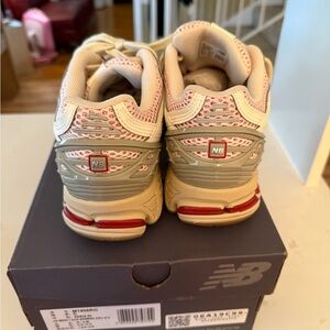 Dynamic New Balance shoes with a red and white design. Perfect for active wear.