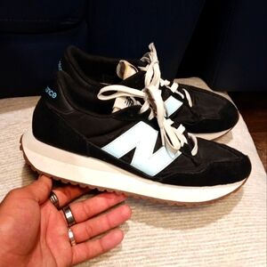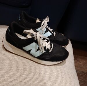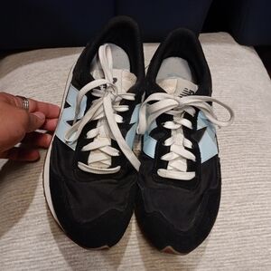 Stylish New Balance sneakers in black and light blue. Perfect for casual wear.