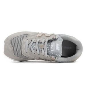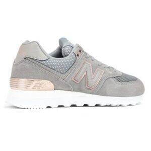 Classic New Balance 574 sneakers in a stylish grey and rose gold colorway.