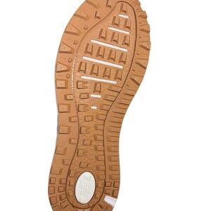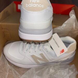 Women's New Balance 574 Greens V2. Waterproof microfiber leather. White with tan details. Spikeless rubber outsole.