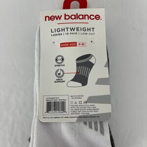 10 pair pack of New Balance lightweight ladies low cut socks. Combo of gray and white. 96% polyester/4% spandex. Machine wash. Stretch, Arch Support. Shoe size 4-10. Smoke and pet free environment.