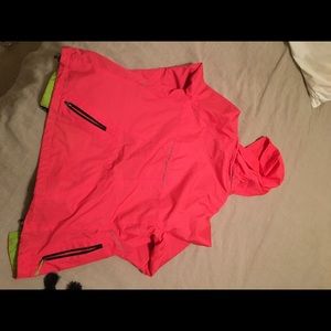 Super cute rain jacket with removable hood and mesh lining. Small stain on right pocket but should come out if you use stain remover - overall still great condition and priced accordingly!