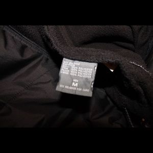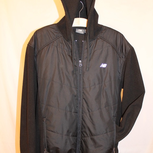 New Balance zip up jacket, thin padded windbreaker feel throughout the chest and fleece for the sleeves and hood. Super comfortable fits great for performance and casual. Size medium but fits like a true Large. no defects👌🏽✨