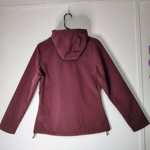 New Balance women's hooded sweatshirt jacket, size S, full zip fleece, burgundy, high neck with hood, long sleeves, adjustable hood, adjustable hem at bottom, 92% polyester, 8% spandex, exterior, 100% polyester lining, zippered pockets, check your measurements carefully, clean garment in excellent condition.