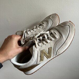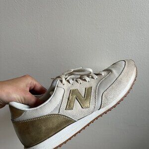 New Balance x J Crew 520 Gold and Cream Sneakers. Gold metallic detailing as well as some suede detailing. Some wear around the edge, pricing reflects that.