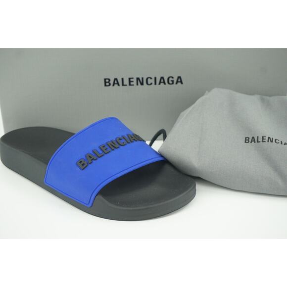New Balenciaga Pool Flat Slide Sandal SZ 36 C Blue $445 Logo Flip Flop Rubber