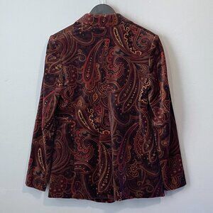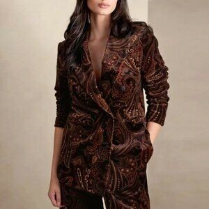 Banana Republic luxe tailored blazer featuring peak lapels, shoulder pads, double-breasted button closure, welt pockets, fully-lined interior, and a soft 100% cotton velvet fabrication in an autumnal paisley print with brick red, chocolate brown, camel, and charcoal grey on a black base.