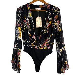New Band Of Gypsies Black Floral Sheer Long Sleeve Bodysuit Size S Whimsygoth