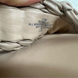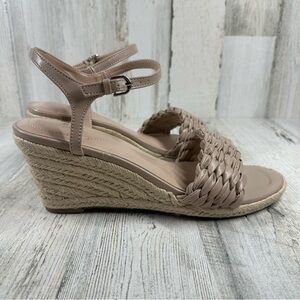 Woven faux leather creates a textured vamp strap on a platform wedge sole created with a espadrille inspired midsole.