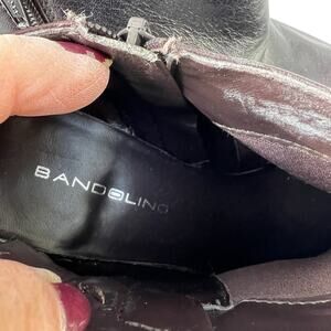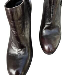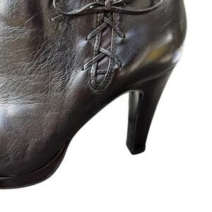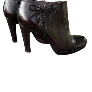 Bandolino women’s size 7M, brown leather, ankle boots with a 4 inch heel & 1/2” platform. Soft leather, rounded toe. Features a zipper on the inside ankle. Criscross lace up/tie feature on outside, for visual appearance. Were $120.