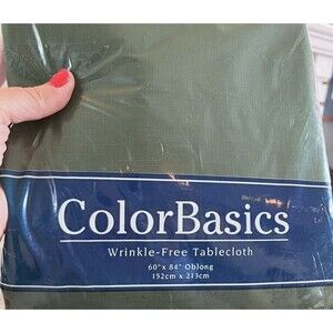 This listing is for a brand new Bardwil Linens Color Basics Green tablecloth. This tablecloth measures 60 by 84 inches and is an oblong shape. It fits 6 to 8 people seated. It is permanent press, stain release, and a cotton-polyester blend. Please look over all pictures carefully before purchasing. It comes from a smoke-free but pet-friendly home. Feel free to message me with any questions. I ship within 24 to 48 hours after receipt of payment.