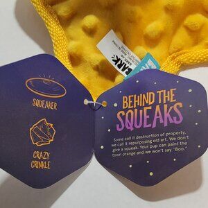 New Bark Box “ Smashing Pumpkin ” dog toy of smashed pumpkin with crinkly yellow pumpkin filing & seeds oozing out from underneath him ! Halloween / Fall themed of a Smashed Jack-O-Lantern . Great Fall & Halloween dog toy . Bark Box toys are very collectible !  This toy features squeaker , crazy crinkle & is hilarious to pose your puppy / dog with for Halloween pictures! Great for tug of war lovers! All Bark Box toys are very durable, if ever gotten dirty, just throw in the washing machine, lay flat to dry & will come out like new & ready for another round of play with your dog! Makes great home decoration / office or desk decoration for fall and Halloween season. Great plush toy for children also.