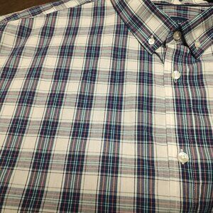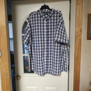 New with tag basic editions short sleeve button down shirt size men's 5XL. It is blue multi-color plaid 32 inches across and 35 inches long.