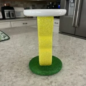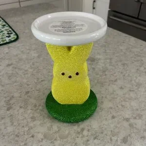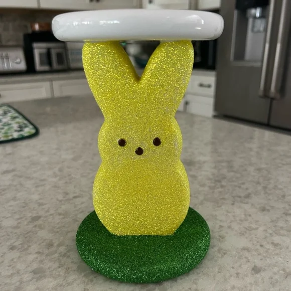 Glittery yellow bunny design. White top and green base. Perfect for adding charm to any room!! Candle not included.