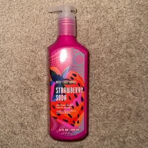 Bath and Body Works Strawberry Soda Cleansing Gel Hand Soap, comes with 3 as shown, new have never been used, full sized 8 fl oz, fragrance notes: fresh strawberries, bubbly seltzer, and crushed ice
