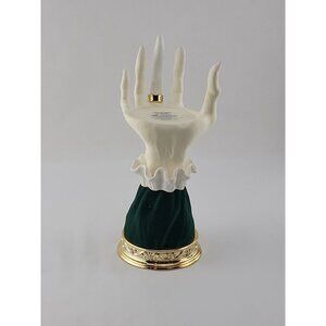 This product is a new Bath & Body Works Witch Hand Pedestal Single Wick Candle Holder, perfect for Halloween decor. Made of ceramic in a medium size with a green color, this candle holder is suitable for a single wick and has a gothic style. It features a green sleeve and a velvet base, adding an authentic touch to any room in your home. The witch hand design, along with the spider ring detail, adds a spooky yet festive vibe to your space.