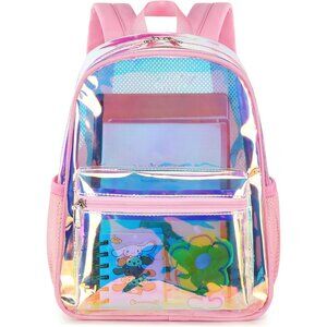 * Iridescent small clear stadium backpack for girls has multiple pockets. 1 main compartment with dual zipper has enough room for your belongings like notebooks, 11inch ipad pro, wallet, sweatshirt or lunch; 1 front zipper pocket fits you charger, headphones, or keys; 2 mesh side pockets fit a water bottle and sport drink. (Not available for A4 size).