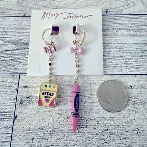 New! Betsey Johnson Book Smart Pink Crayon & Box pink bows Dangle Drop Earrings