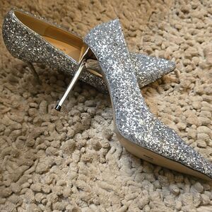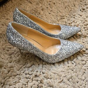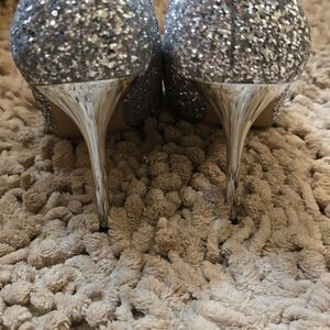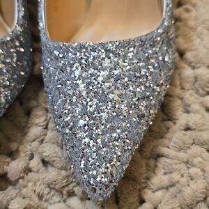 New Bigtree Women's size 40 or 8 1/2 Silver glitter 4 inch stiletto shoe mirrored heel, perfect for wedding, cruise, honeymoon, or that special night out, excellent condition