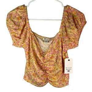 New! Billa Bong Peasant Croped Rushed Floral Print Orange Women’s Top Sz L