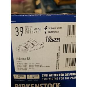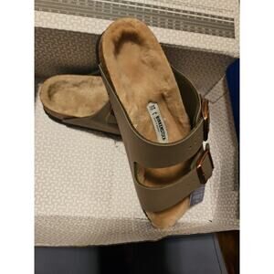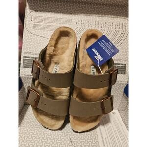 This is a pair of Birkenstock Arizona Shearling-Lined slide sandals for women in a stone color. They are US shoe size 8-8.5 and made with a manmade upper material. These sandals feature a cozy shearling lining, making them stylish and comfortable for everyday wear.