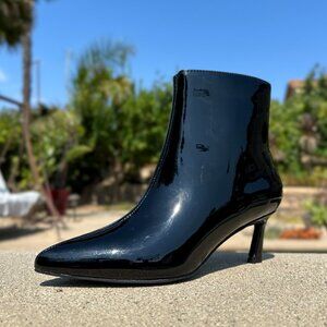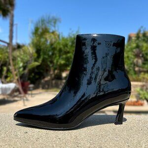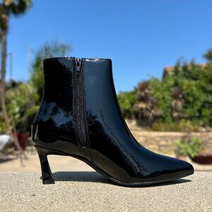 Step on the scene looking better than ever in these chic ankle booties! These faux patent leather booties flaunts a chic profile with pointed toe, kitten heel and side zipper that look professional with suit and trendy with mini dress.