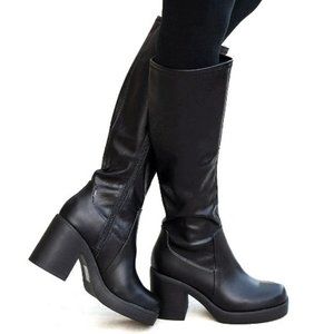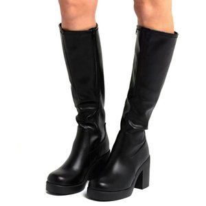 New Black Knee High Platform Round Toe Chunky Heel Boots