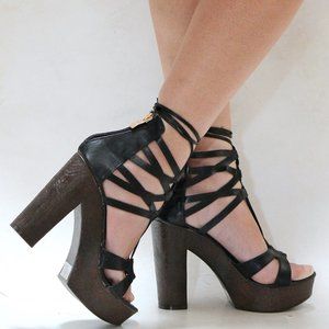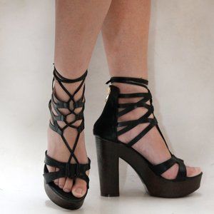 Step out in these feminine chunky heel sandals New in box Man made leatherette material Adjustable lace Back zipper for easy shoe removal Lightly padded insole Heel height: 4.5 in. Platform 1.25 in. Fitting: true to size. Regular foot width.