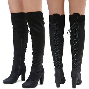 New in box Faux suede material Adjustable back lace Side zipper for easy shoe removal Comfy faux fur spongy boot lining Comfy chunky high heels Heel height: 3.5 in. Boot opening: 15 in. (adjustable) Boot height, including heel: 20 in. Fitting: true to size. Regular foot width. Adjustable calf due to laces.