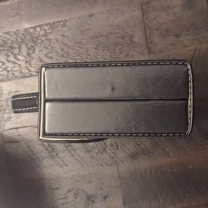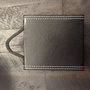 Elegant black leather jewelry case with white stitching. Perfect for travel or storage.