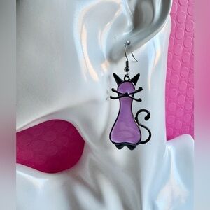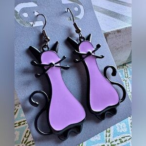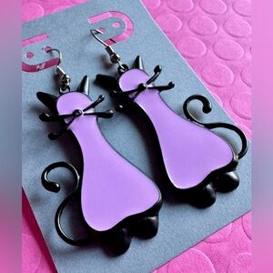 New Black Metal & Purple Enamel Kitty Cat Dangle Statement Earrings - 2.5”