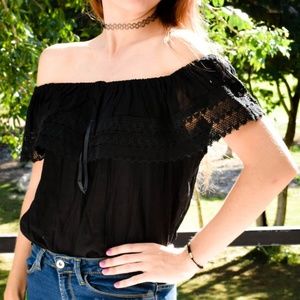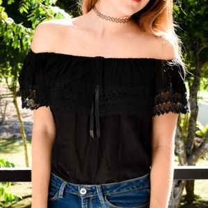 New solid black blouse, made with lightweight gauzy fabric, with lace and ribbon accents.