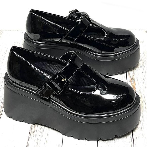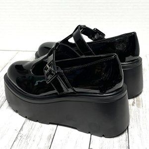 Step out in these newly arrived, stylish platform Mary Jane New in box Vegan patent leatherette material Adjustable buckle straps Lightly padded insole Comfy chunky platform lug soles Platform height: 1.5 in. Heel height, including platform: approx. 2.75 in. Fitting: true to size