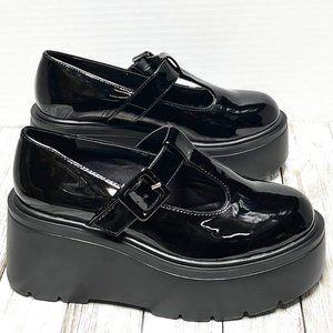 New Black Patent T-Strap Platform Mary Jane Wedge Ballet Flats