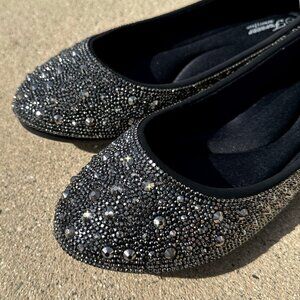 This sparkling crystal encrusted ballet flat proves that you never need to sacrifice style for comfort! Easy slip-on wear with a rounded-toe silhouette. The memory foam cushion insole keeps you comfortable all day!
