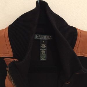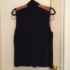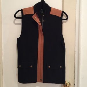 Brand new (never worn) Ralph Lauren vest in black stretchy sweater material with beautiful Camel colored leather detail on front and shoulders. Snap buttoned pockets in front. A rare find at the headquarter store in midtown Manhattan. Size M (sweater vest itself is stretchy accommodating to any L. Awesome piece with any all black outfit. Retails at over $180 selling for a fraction or best fair offer!