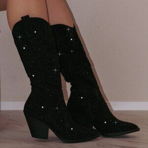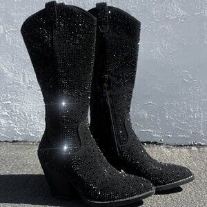 New Black Rhinestone Western Cowboy/Cowgirl Mid Calf Knee Boot 3" Block Heel Zip