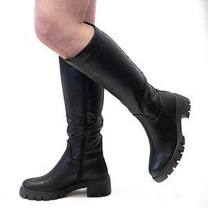 New Black Round Toe Chunky Heel Knee High Riding Boots