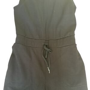 New without tags black jumpsuit has no inside identification tags, but is polyester blend. Scuba type fabric in black for a slimming look. Round neck, sleeveless small button in the back to close. Elasticized wide waistband also has a really cute drawstring tie. Side pockets. Very comfortable and will look great when you go out or lounge at home. Measurements are taken flat and are approximate.